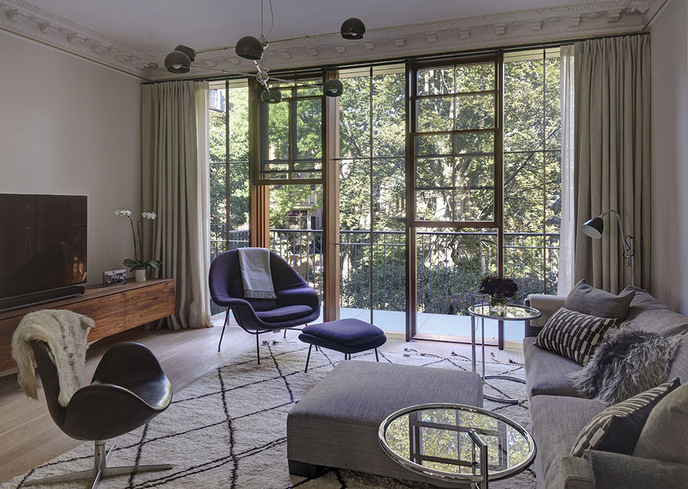 This rather narrow (16' wide) South End Town House backing onto a beautiful private urban park was in a woeful state of disrepair. Years of a leaky roof had degraded any original finishes past the state of saving and had caused the rear masonry wall to detach from the rest of the building and lean dangerously toward the park. Rebuilding this wall was an opportunity to open the lower three floors of the house to the park. Although unified, the window assembly's operation is unique to each floor. The entire assembly adapts to its neighbors by maintaining the 19th Century profiles, intervals and mechanics. The wall above re-uses the face brick of the original wall to maintais compatibility with the neighbors.